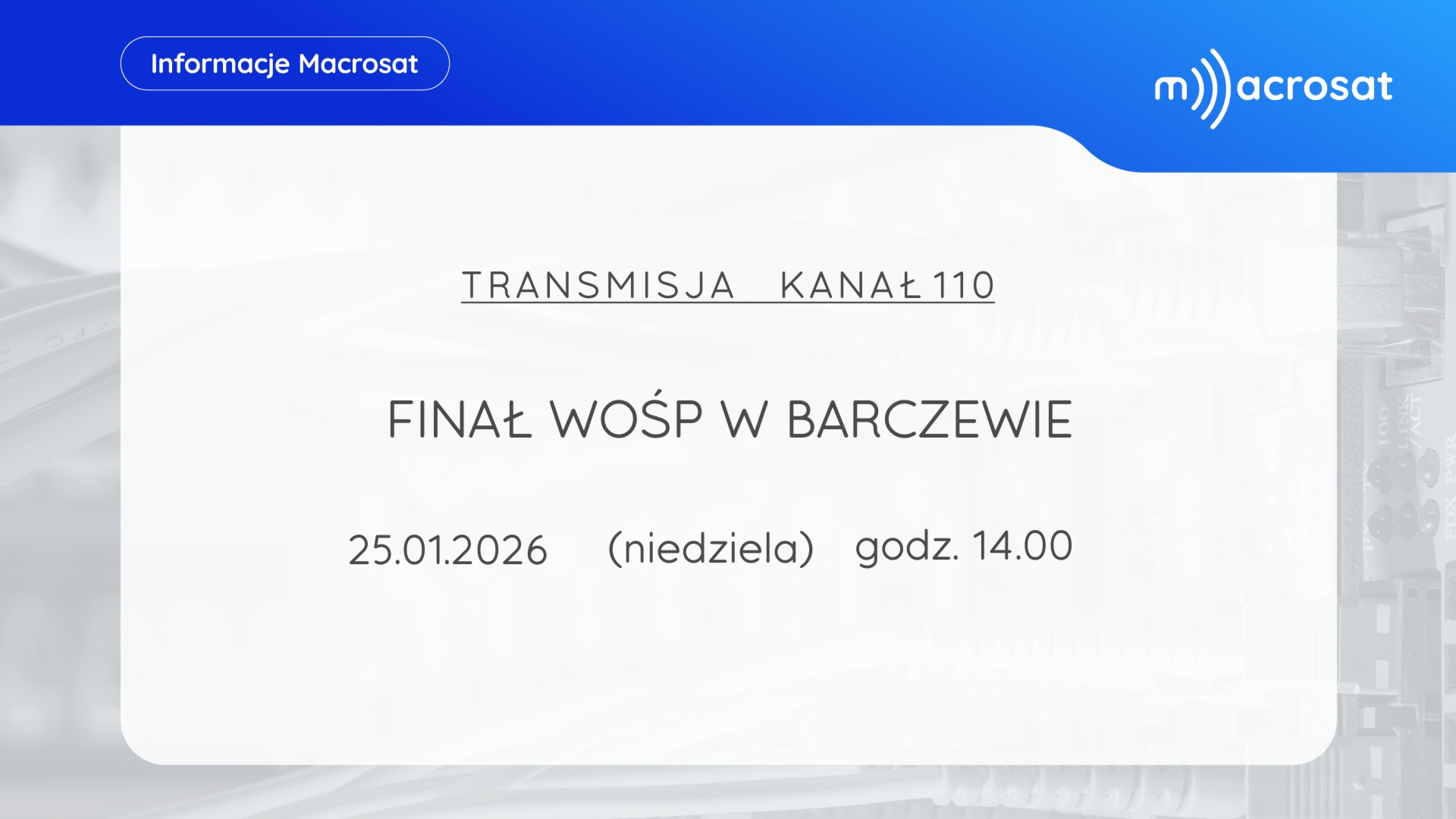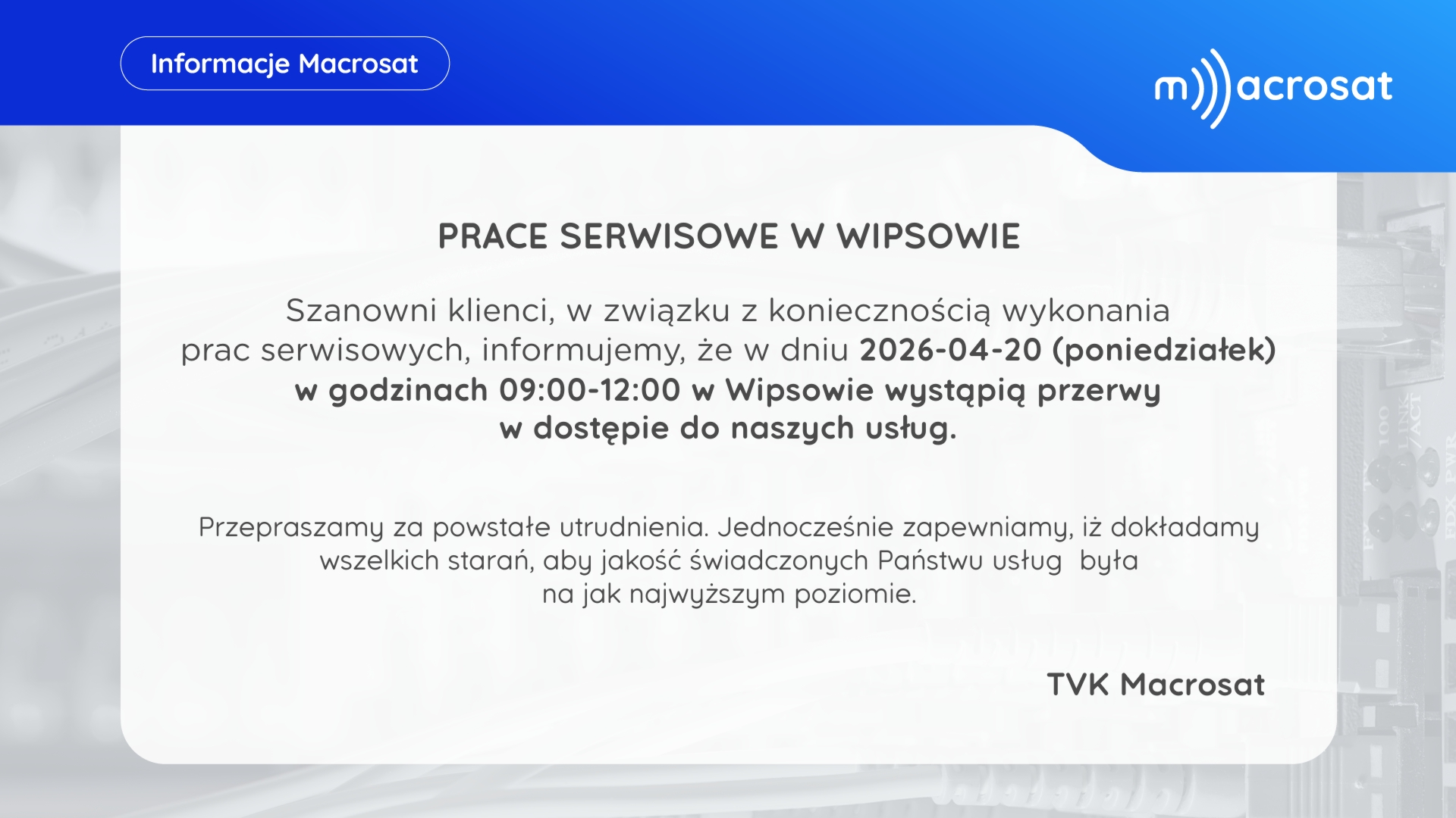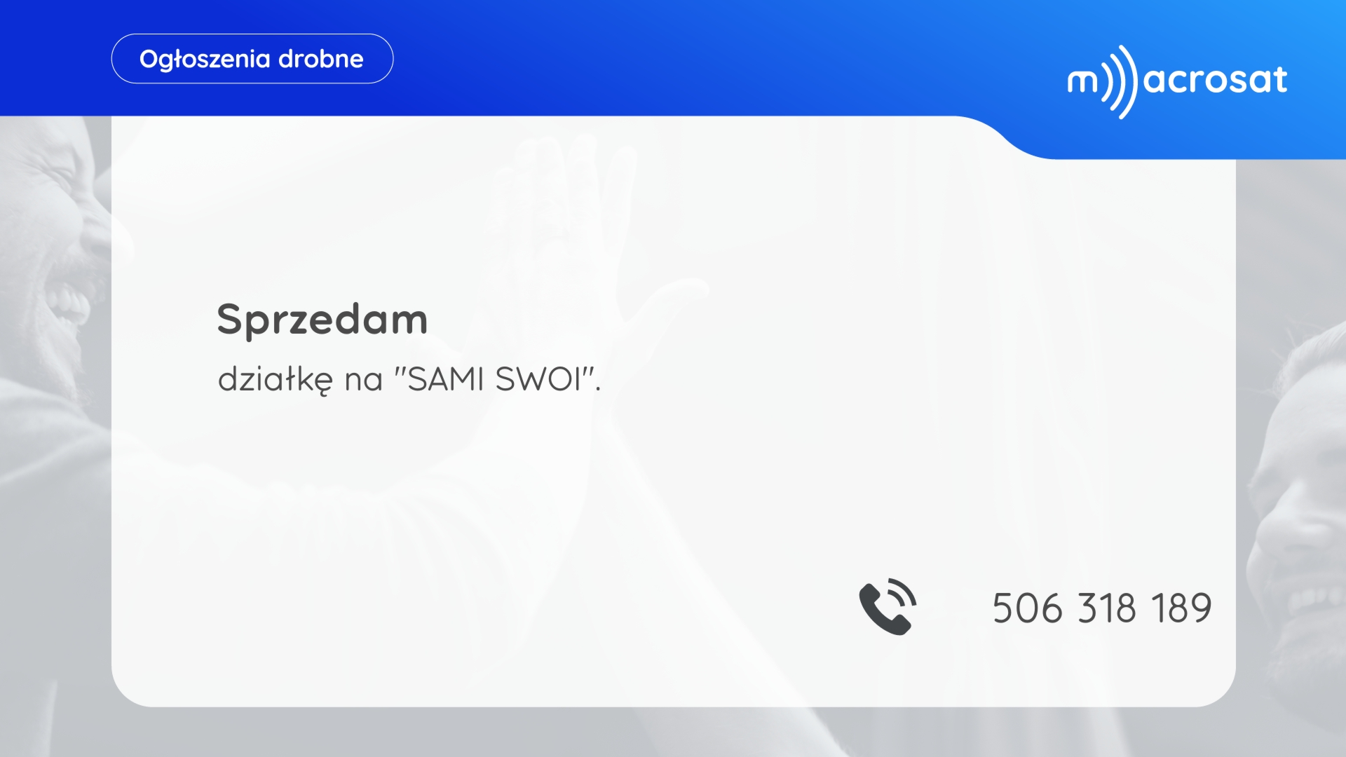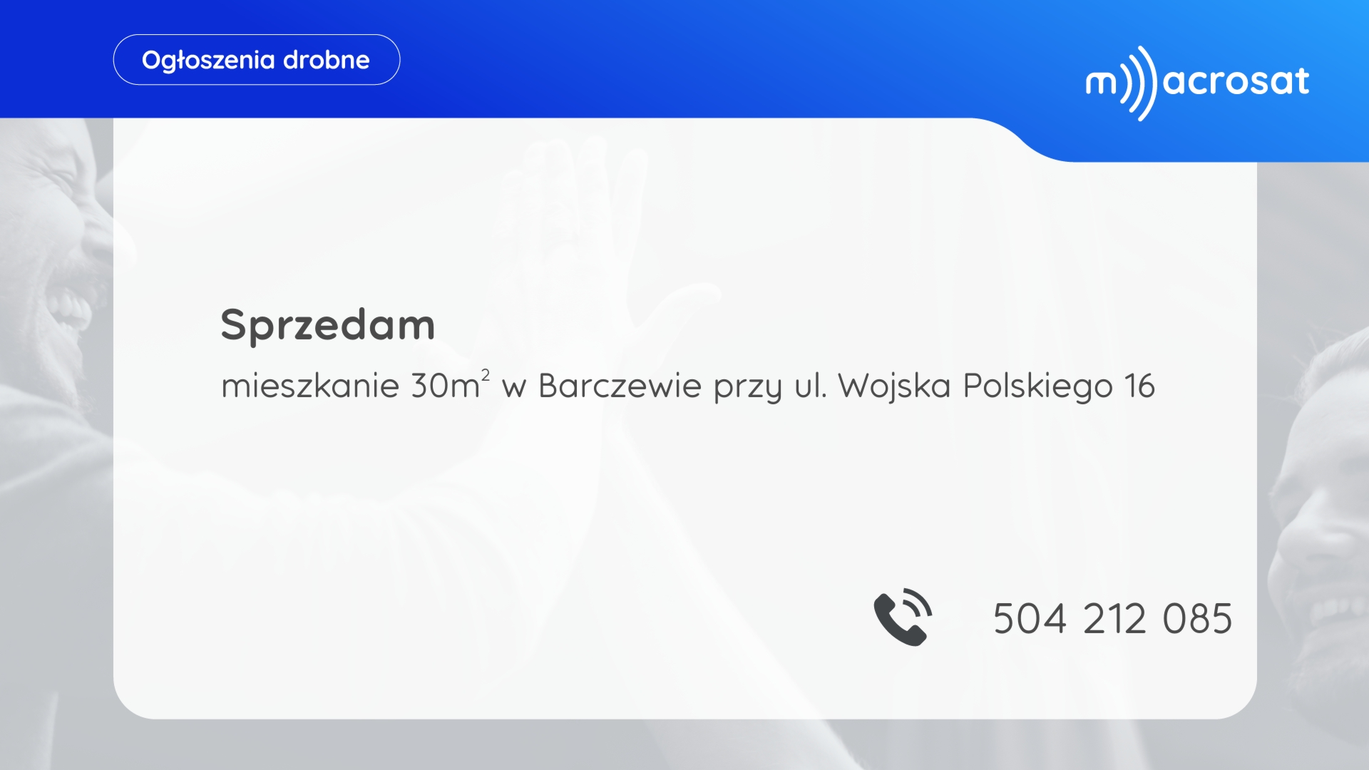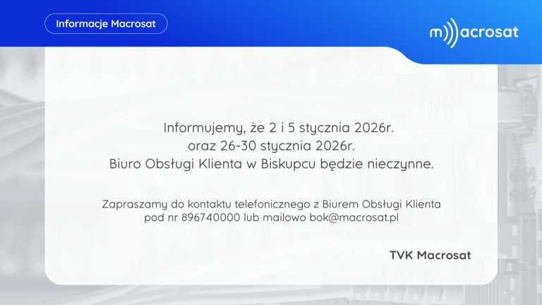 Aktualne ogłoszenia dostępne są na kanale 100 w telewizji kablowej Macrosat. Poniżej prezentowane ogłoszenia aktualizowane są w każdy piątek o godzinie 15. Jeśli chcesz zlecić emisję ogłoszenia, skontaktuj się Biurem Obsługi Klienta.